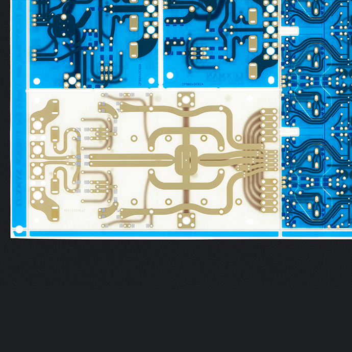 所有的音頻信號(hào)回路都使用了鍍金的100μm厚銅箔,并且采用了特殊構(gòu)成的去膠涂層基板,該基板信號(hào)線上沒有抗腐蝕層。通過排除抗腐劑覆蓋帶來的容量成分影響,降低圖案阻抗,將頻率劣化降至最低。并且通過盡可能保持寬度一致、拐角光滑的圓滑曲線來繪制走線圖案,確保即使是最微小的音樂信號(hào)也能順暢無阻地流動(dòng)。